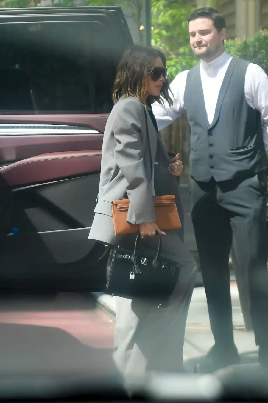 This ensemble is not only elegant but also incorporates key fall trends: warm tones and relaxed silhouettes. To complete the look, Victoria added a brown Hermès Kelly bag and a black Birkin, proving that two handbags can be better than one when aiming for a sophisticated appearance.