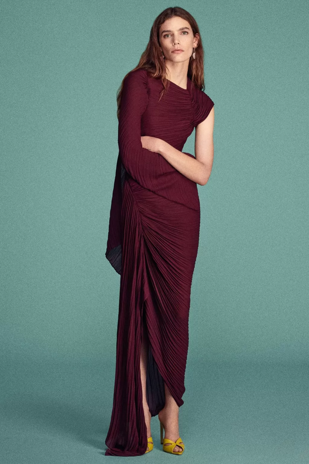 The result is a proposal where femininity is understood as movement. The dresses feature deep draping, vibrant textures and a play on volume that enhances the silhouette without losing natural ease. Among the standout pieces is a long burgundy dress with a delicate neckline and asymmetric hem, balancing drama with contemporary elegance. There are also fitted midi dresses with handcrafted details, as well as silk halter designs with prints reminiscent of Picasso or Matisse at their most expressive.